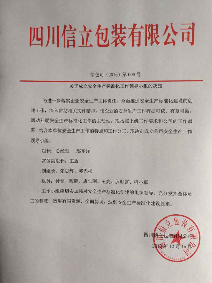 关于成立安全生产标准化工作领导小组的决定
